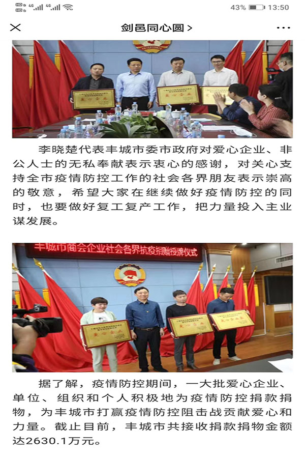 4月29日,江西省豐城市為在新冠肺炎疫情防控中踴躍捐款捐物的愛(ài)心企業(yè)、單位、組織和個(gè)人舉行授牌儀式, 市委書(shū)記李曉楚、市委副書(shū)記、代市長(zhǎng)徐結(jié)強(qiáng)、市委常委統(tǒng)戰(zhàn)部長(zhǎng)熊曉群出席儀式。