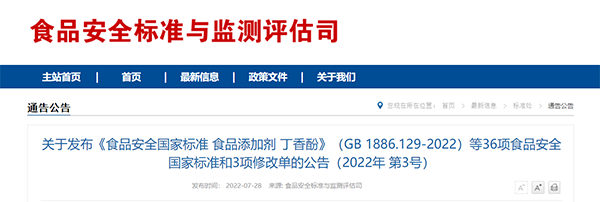 根據(jù)《中華人民共和國食品安全法》規(guī)定,經(jīng)食品安全國家標(biāo)準(zhǔn)審評委員會審查通過,現(xiàn)發(fā)布《食品安全國家標(biāo)準(zhǔn)?食品添加劑?丁香酚》(GB?1886.129-2022)等36項(xiàng)食品安全國家標(biāo)準(zhǔn)和3項(xiàng)修改單。其編號和名稱如下: