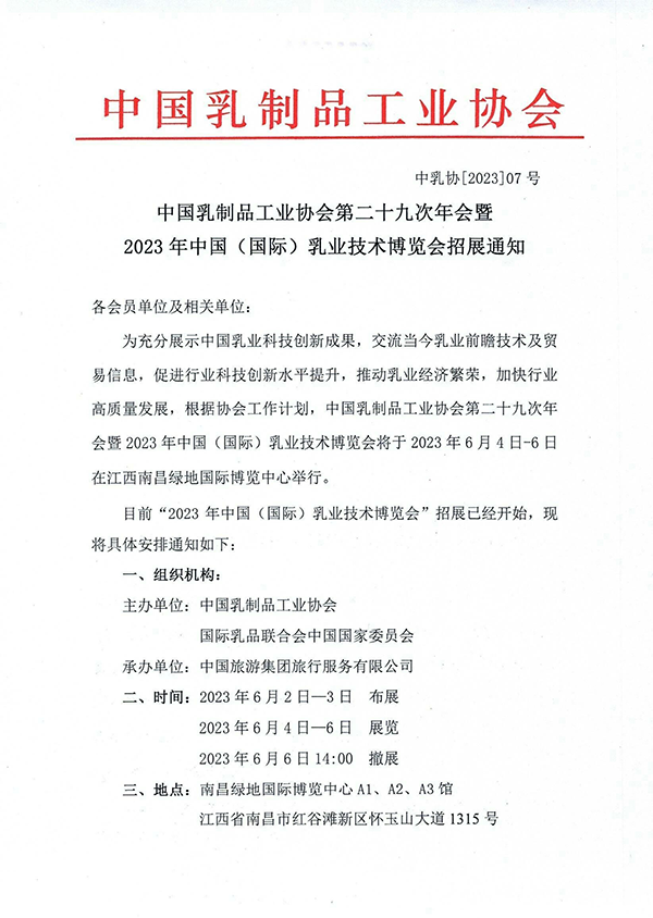 中國(guó)乳制品工業(yè)協(xié)會(huì)第二十九次年會(huì)暨 2023年中國(guó)(國(guó)際)乳業(yè)技術(shù)博覽會(huì)招展通知