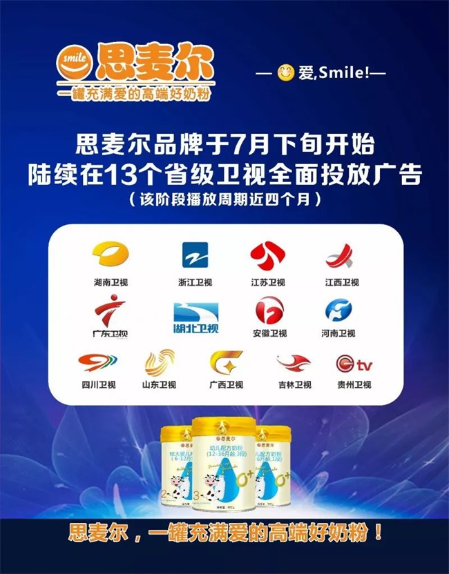 3、7月下旬或8月初,思麥爾品牌繼第一周期央視廣告后,又將在湖南衛(wèi)視、浙江衛(wèi)視、江蘇衛(wèi)視等13大省級(jí)衛(wèi)視頻道播出,廣告周期近四個(gè)月,開(kāi)啟2018第二周期廣告計(jì)劃。