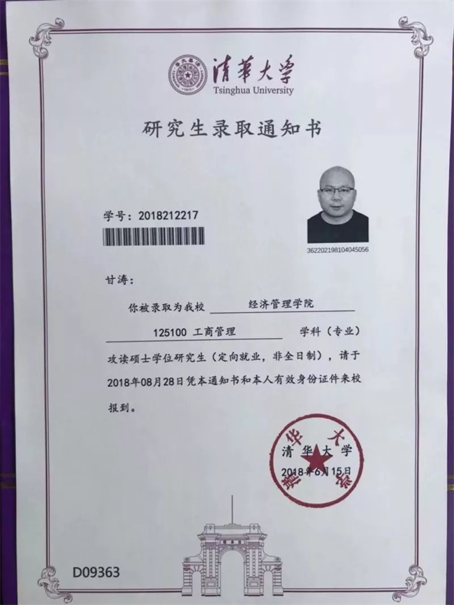 2017年,甘濤先生通過(guò)嚴(yán)格面試及全國(guó)研究生統(tǒng)考,已考上清華大學(xué)經(jīng)濟(jì)管理學(xué)院高級(jí)工商管理研究生,將于2018年8月份正式報(bào)到入學(xué)。