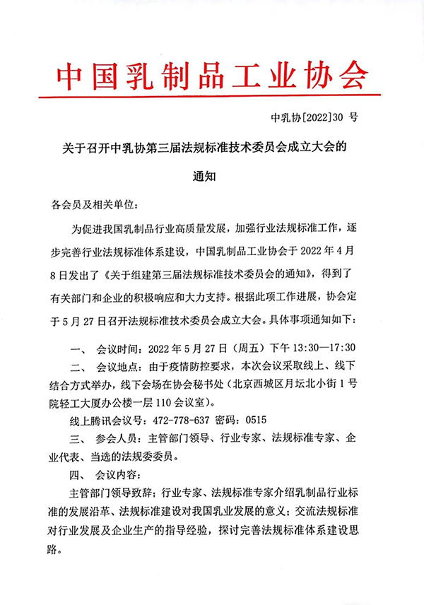 關(guān)于召開中乳協(xié)第三屆法規(guī)標(biāo)準(zhǔn)技術(shù)委員會(huì)成立大會(huì)的通知