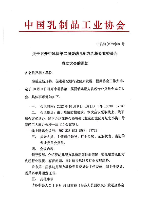 關(guān)于召開(kāi)中乳協(xié)第二屆嬰幼兒配方乳粉專(zhuān)業(yè)委員會(huì)成立大會(huì)的通知
